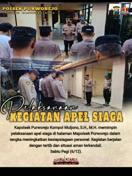 Purworejo Kupastajam.com, – Kapolsek Purworejo, Kompol Moljono, SH., MH., memimpin langsung kegiatan apel siaga yang berlangsung di halaman Mapolsek Purworejo pada Sabtu pagi, 6 Desember 2025. Apel tersebut digelar sebagai langkah strategis untuk meningkatkan kesiapsiagaan seluruh personel dalam menghadapi perkembangan situasi kamtibmas di wilayah hukum Polsek Purworejo.