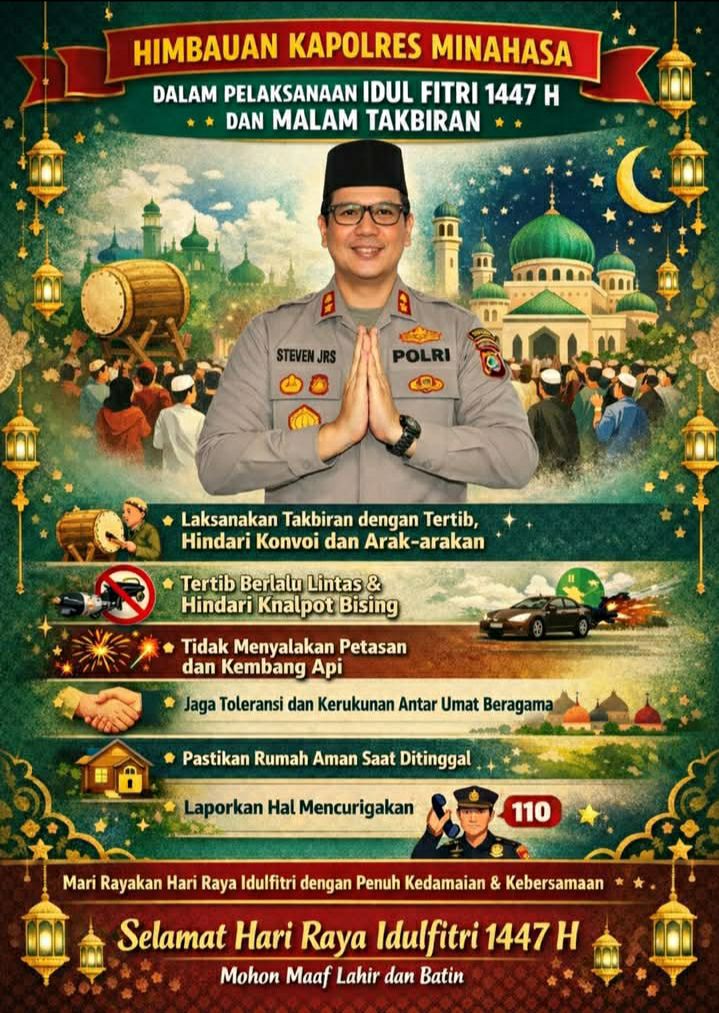 MINAHASA – Menyambut momen kemenangan bagi umat Islam di seluruh dunia, Kapolres Minahasa mengeluarkan himbauan khusus kepada seluruh masyarakat wilayah Minahasa untuk bersama-sama menjaga keamanan, ketertiban, dan suasana kondusif selama malam takbiran dan perayaan Hari Raya Idulfitri 1447 H. Himbauan ini disampaikan sebagai bentuk upaya kolaboratif antara pihak kepolisian dan masyarakat dalam mewujudkan perayaan yang penuh kedamaian dan kebersamaan.