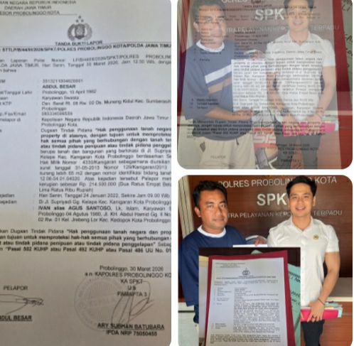Akhirnya Oleh sebab kejadian tersebut di atas (AB) Beserta Penasehat Hukumnya Melaporkan Peristiwa tersebut Di POLRES PROBOLINGGO KOTA POLDA JAWA TIMUR Dengan NOMOR: LP/B/44/III/2026/SPKT/POLRES PROBOLINGGO KOTA/POLDA JAWA TIMUR. Hari senin Tanggal 30 maret 2026