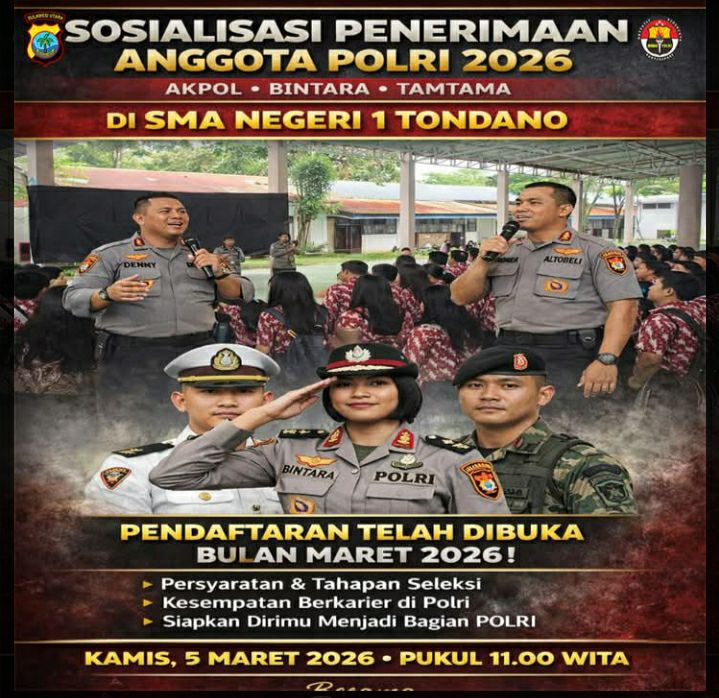 Tondano, 5 Maret 2026 – Personel Satuan Binmas (Bimbingan Masyarakat) menggelar kegiatan sosialisasi terkait penerimaan Calon Anggota Kepolisian Republik Indonesia (Polri) Tahun 2026 di SMA Negeri 1 Tondano pada Kamis (5/3/2026). Kegiatan yang bertujuan untuk memberikan pemahaman lengkap kepada para siswa tentang berbagai jalur penerimaan angkatan baru Polri ini berlangsung secara aman, tertib, dan lancar di aula utama sekolah.