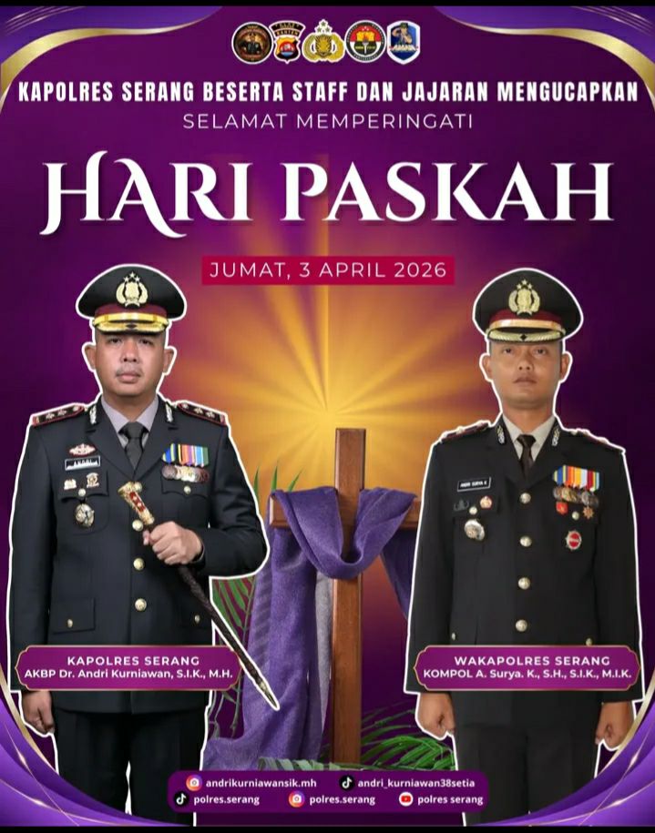 “Selamat memperingati Hari Paskah bagi seluruh umat Kristiani di wilayah hukum Polres Serang maupun di mana pun berada. Semoga perayaan suci ini membawa berkah, sukacita, dan kedamaian bagi kita semua,” ujar AKBP Dr. Andri Kurniawan dalam keterangannya, Rabu.
